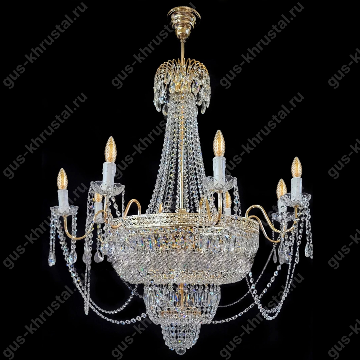 Люстра Хрустальная подвесная Александрия №21 производства г. Гусь-Хрустальный, модель представлена в форме круга. Хрустальная люстра крепится на крюк, подходит ко всем видам потолка. Высота данной люстры от потолка до последнего хрусталика 100 см, диаметр 130 см. Данная модель люстры подходит как под классический стиль, так и под современный. Поставляется в собранном виде готовая к подключению. Для того чтобы Ваша люстра всегда сверкала как новая, ухаживать за ней не составит труда, т.к. чистят хрустальные люстры специальным Средством для бесконтактной чистки Хрустальных люстр.